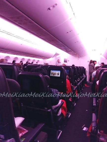 飛機準時起飛,設計新穎的仿皮坐位是3-3-3排列,但略嫌機艙燈光昏暗,晚餐及早餐味道都不錯!