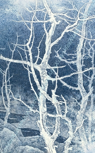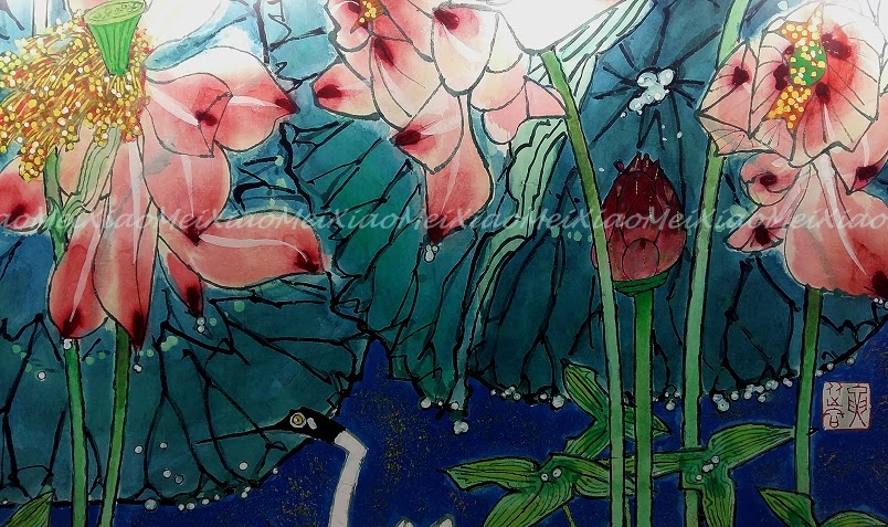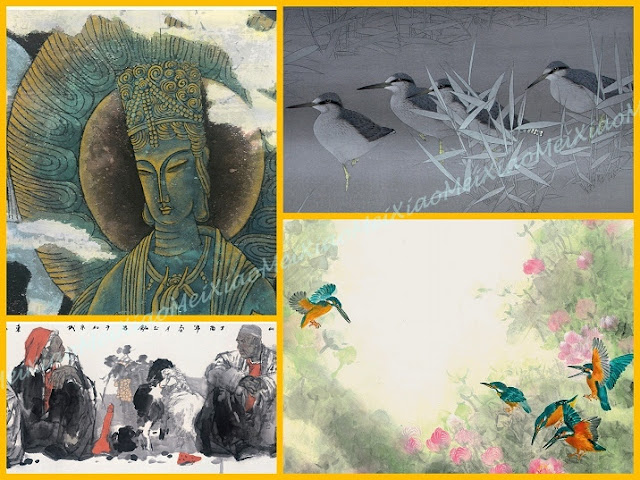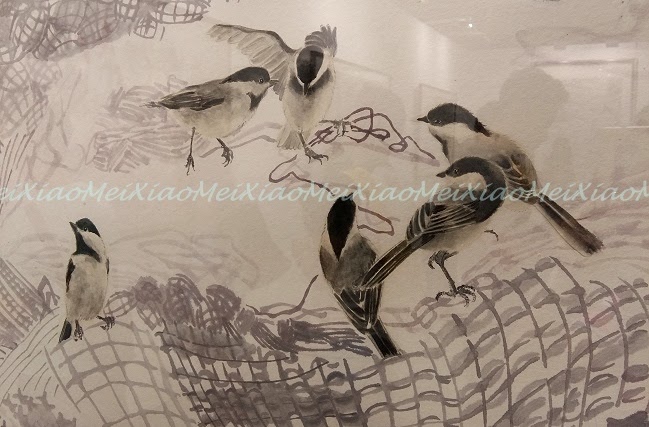花鳥蟲魚是水墨畫中不可缺少的,今所見識到的倒加入了不少新元素,色彩不單嫣紅、翠綠、還有藍、黃、金、銀……把構圖點綴得更立體、更誘人,尤其欣賞留白方式繪成枝的作品,皆因在潑墨時要拿捏得剛剛好!
