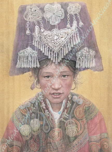 色彩之豐富,使人誤以為在看水彩畫,但畫中的筆觸卻比水彩畫更為細膩~~貼復的髮絲、輕紗若霧、黑亮的眸子……畫功柔順。